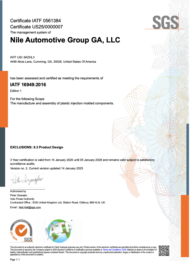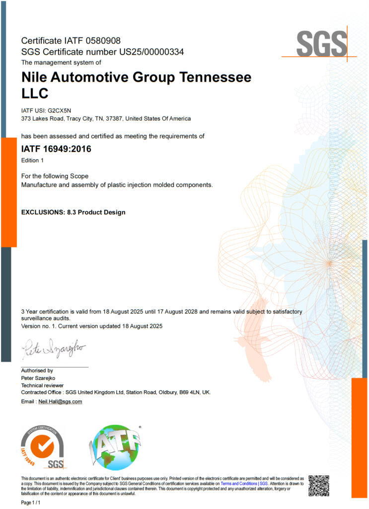 Nile Automotive Inc. operates under the strict guidelines required by the most disciplined international OEM’s. Our commitment of continuous quality improvement is strengthened by our best practices according to customer requirements